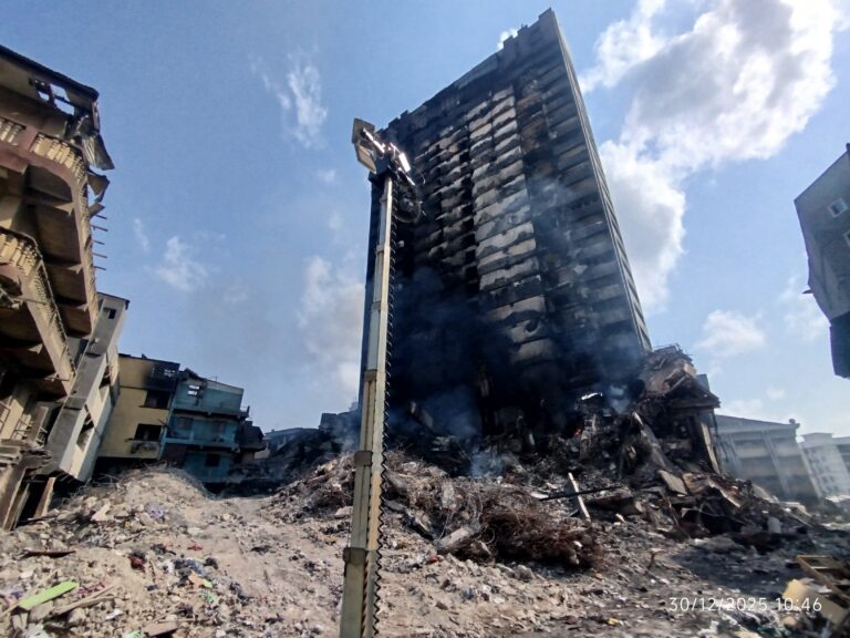 When FIJ visited the scene of the fire on Tuesday morning, six days after the incident, the 22-storey building known as the Great Insurance House stood tall but was still covered in smoke. The fire was still burning.
